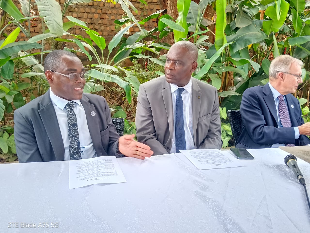 Mike Chibita (middle) and other ;eaders of the Bible Society of Uganda addressing the media today